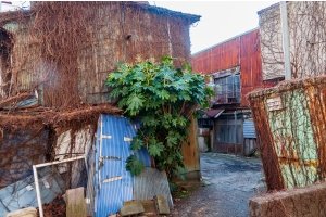 中へ進んで振り返るとこんなかんじで左右にお店の廃墟となって残っている状態。 地元民にとっては生活の道でもあり、こう見えてもたまに人通りがあるんですよね。 私がいる間に2人と郵便配達の原付も1台通りました。