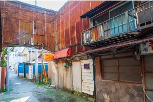 藤沢駅北口の銀座土曜会商店街(サムジュモール)から路地を入ってすぐの所に、藤沢新地の名残りである赤線跡の残骸が生々しく残されている。「飲食朋友会」なる名称のバラック飲食店で、その入口にでかい板張りのゲートが掲げられているのが凄まじい威圧感を放っている。内部は二