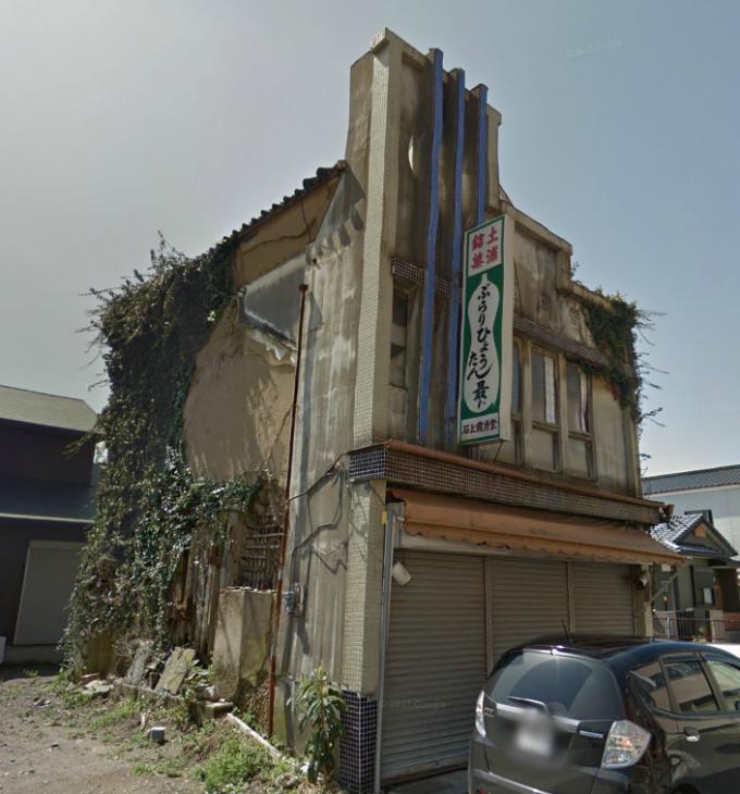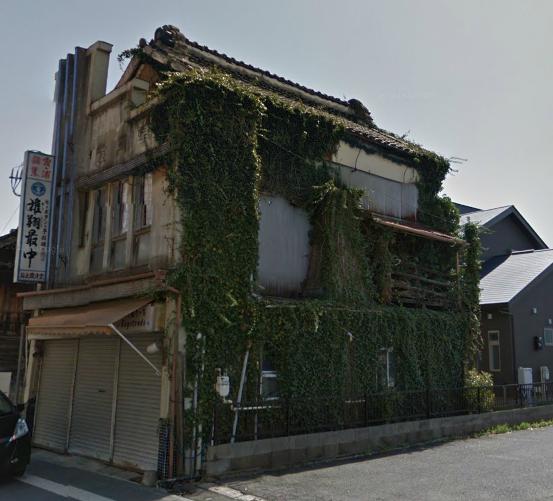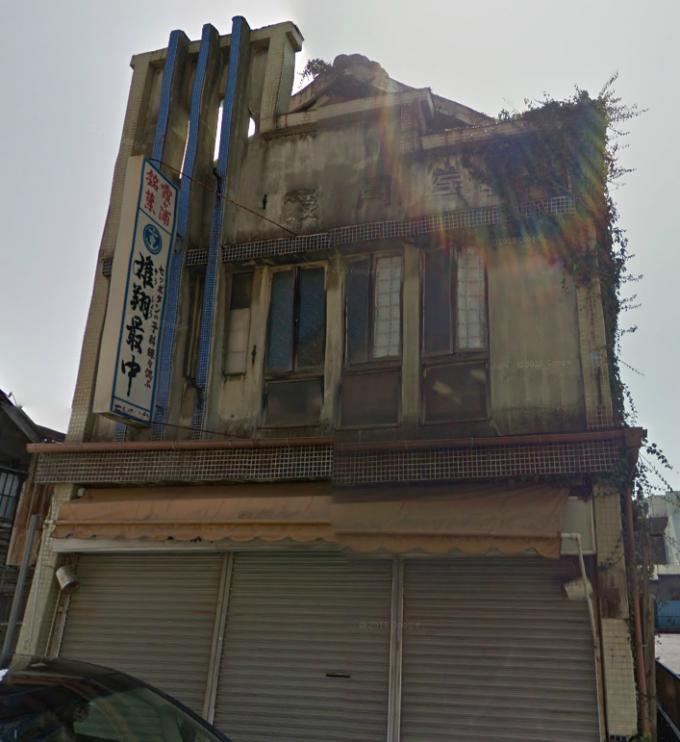 そのお隣の和菓子屋さんは既に廃墟。営業をやめてかなり経っているみたいです。しかし、この建物のファサードは面白い。青いモザイクタイル貼りのリブが丸窓を貫いています。この中城商店街には古い建物が残っていて、城下町の雰囲気がそのまま。上記の2軒の観光案内所ももともと