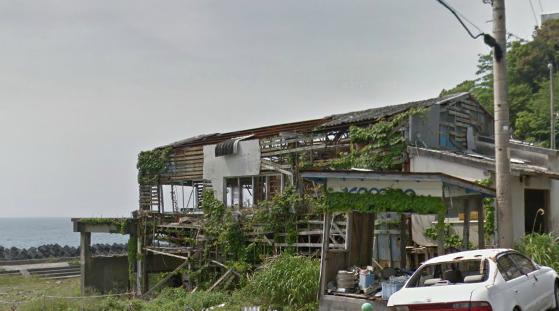 道路終点の先は市有地のようで、封鎖されていた。ちょっと、物々しい雰囲気だ。先にあるこの建物は、かつてホテルだったそうだ。そして、海寄りにはこんなオブジェ?がある。以前はもっと別の建物もあったらしく、この場所は「海洋牧場中央研究所」という施設だったそうだ。