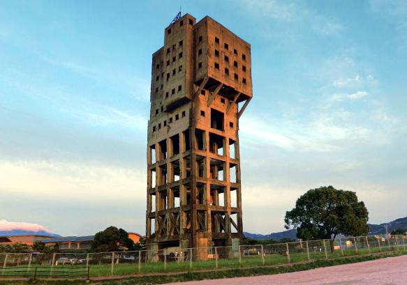九州旅3日目唯一の晴れ空福岡ののどかな田舎町「志免町」異様な姿で聳えるコンクリート建造物志免炭鉱竪坑櫓昭和18年に旧海軍が石炭採掘のため地下430メートルからトロッコを巻き上げるために建造されたもの。ワインディングタワー