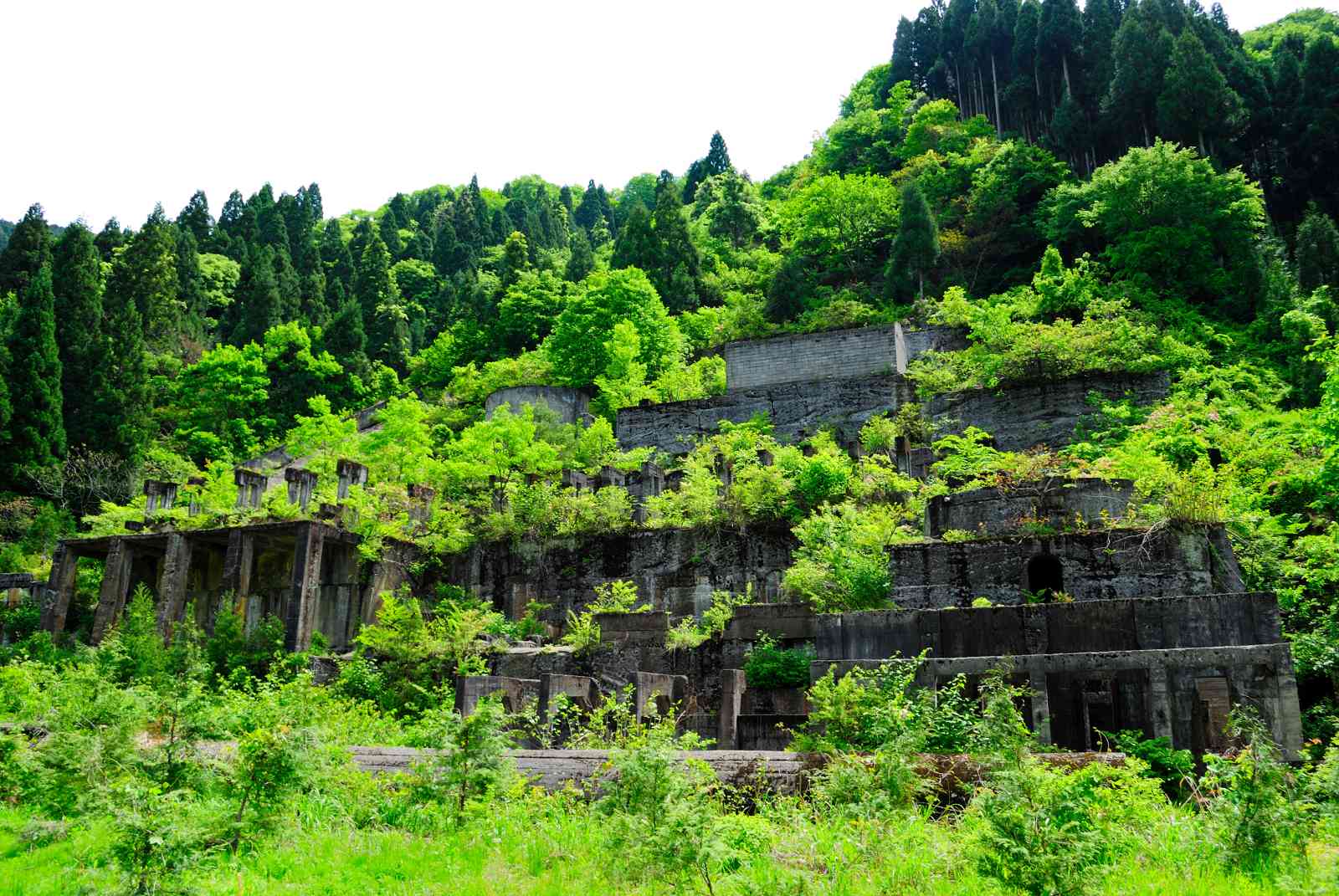 滋賀県北部の廃鉱山。1965(昭和40)年閉山。他の鉱山に比べて閉山が割と早いせいか、かつての繁栄を感じることは難しい。残っているものも、目立つのはこの選鉱場跡くらいである。ここまで来てやっと鉱山があったことが実感できる。コンクリートの選鉱場跡。尾去沢を小さく