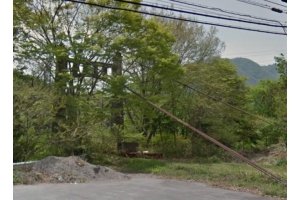 これが竹の上橋です。地図の県道23号と白い道が合流する反対側付近に、巨大な橋の主塔が残っています。竹の上橋は、巨大な主塔を両側に持つ吊り橋ですが、一般的な吊り橋の主塔が橋の上にあるのに対して、この竹の上橋は、主塔が両岸の土地上にあり、吊り橋のワイヤーがかなり手前の土地まで張り出しています。