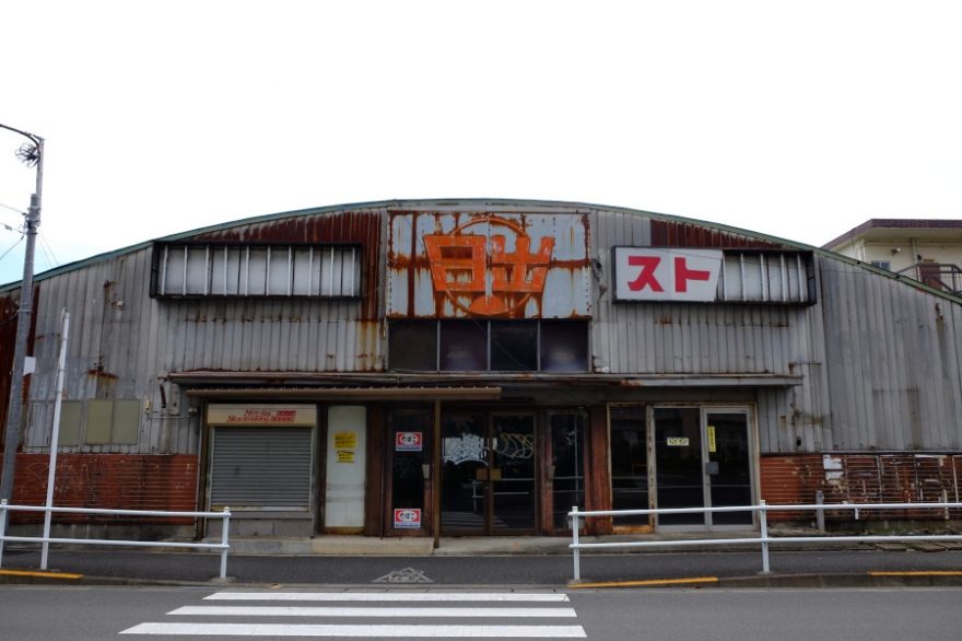 その団地の南端に、忘れ去られたように日の出ストアーは佇んでいました。しかしよく見れば入り口は閉ざされ落書きまでされています。もう、この建物を発見した時からあった予感は、確信へと変わりました。入り口には鍵が掛けられており、中を覗けば閉ざされたシャッターの列。左脇