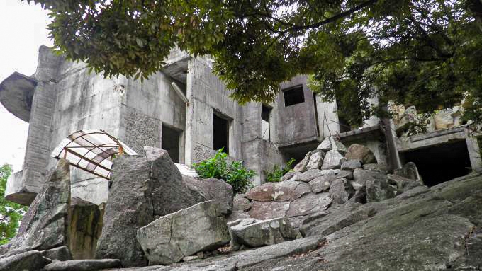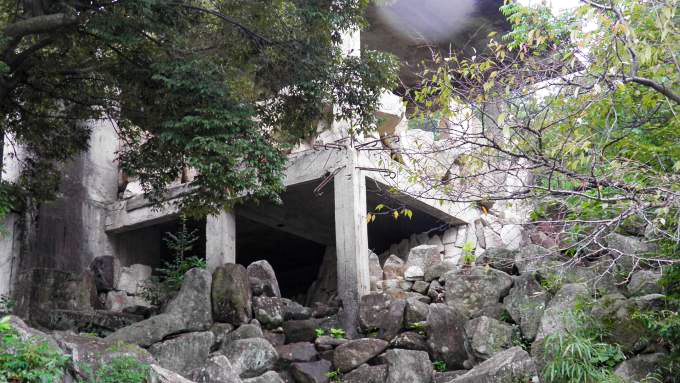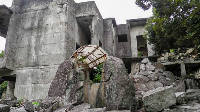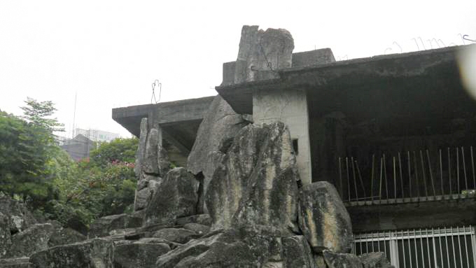 不思議な廃屋。多くの岩が敷き詰められたような敷地に、コンクリート二階建ての建物が建設途中のまま何十年も放置されている。住宅地のド真ん中。学生の姿も目立つので、近くには学校もあるようだ。