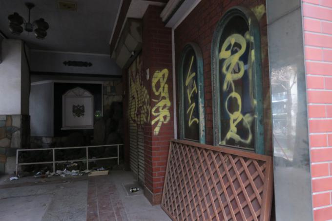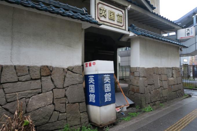 栄町駅の目の前に建つ「英国館」も日本の城を模している。1階部分は○俗店だったらしいが、現在、正面入口は閉鎖されている。2階以上は「ビジネスマンション大老」という一泊から利用できる施設になっているようで、iタウンページに登録がある。