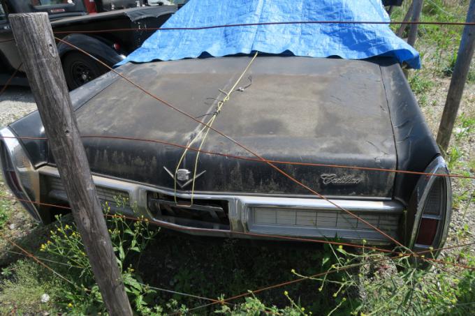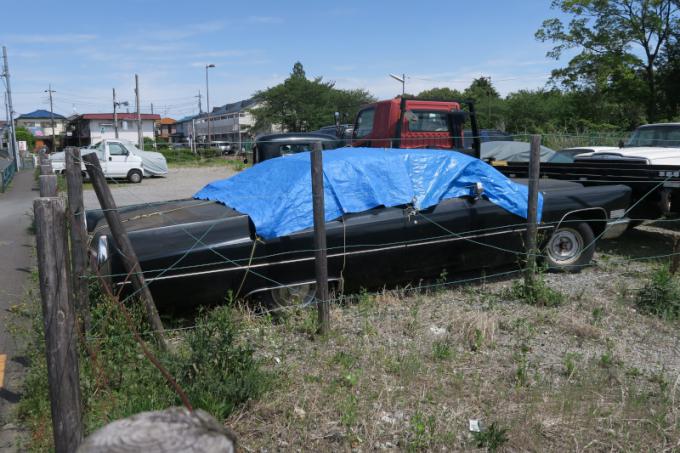 東京都府中市のキャデラック。 ナンバープレートは付いていないが、駐車場内に設置されブルーシートが....