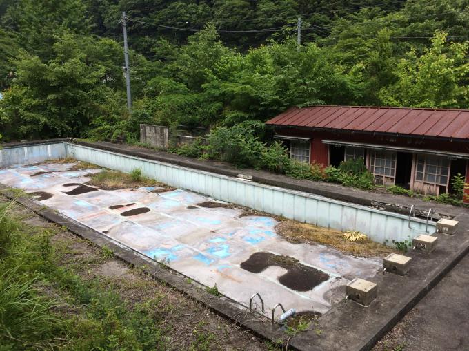 鴨沢小中学校は1983年に閉校。校舎跡から600メートル程離れた場所に、こちらの坂本集落プール跡が残っている。