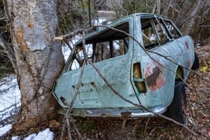 廃屋ではなくて廃自動車ですが、放棄されてから長いのでしょう、フロントガラスがなくなっていて、内部に土が積もり、そこから植物が生い茂ってこんなになってしまっています。なんというか、こうなるともう、遺跡みたいな感じです。廃屋もそうなんですが、こういう物件を見るとじ
