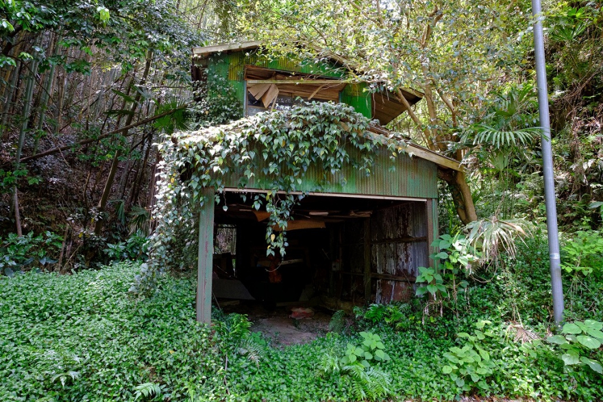 静岡県伊東市鎌田の家。 木造2階建ての民家で、1階が大きなガレージになっている。細い急坂のコーナー....