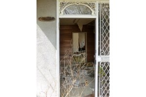 1階部分の壁が崩れ落ち、大きな穴が開いている廃屋。大きな建物なので、元は店舗だったのでしょうか。