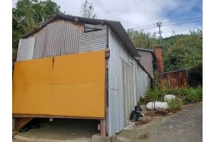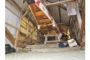 石祠は桜御前の銘、赤い建物はOKエンタープライズ研修施設跡、赤煉瓦煙突は製塩所跡。