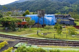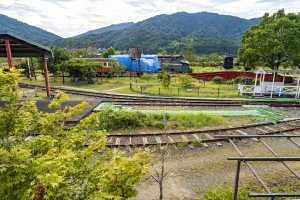 撮影日 2000/04/16 所在地は京都府与謝郡与謝野町滝 右は南海電気鉄道1201形電車モハ1202 左は1260形蒸気機関車1261右は2号蒸気機関車 左C58 390、右C57 189