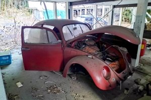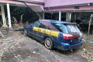 落ち葉が降り積もり廃車が放置されている