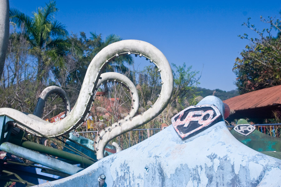 Back to Taiwan PageKatoli World Taiwan Welcome to Katolis World located in Dakeng Scenic area outside of Taichung, Taiwan. I used to pass by this place regularly on my weekend trips into the mountains and finally one day a friend and I ventured up the stairs to see what was actually there. The park was closed after a massive earthquake on September 21st, 1999. Thousands of people were killed during the quake but unlikely that anyone was killed in the park as it was a Tuesday and likely closed. Either way, we snuck under the poorly barbwired turngates and spend a few hours walking around.The map of the park was still intact. We explore the majority of the park but the 2 buildings on the far right were unreachable as it had been crushed during the quake and covered with new forest growth. Pics of the area later on.Alright we thought the haunted house would be the eeriest of all the things to see but i...ve been done fairly low budget.This was one of the two rollercoasters that the park had but unfortunately there was no way to get up close without actually climbing the track and on that day I wasn't feeling adventurous enough as it is quite elevated from the ground. The loop from the rollercoaster still looking fairly intact. These spiders were everywhere in the park, they are about the size of a fist but luckily not poisonous from what I was told. I had a few of em crawling on my shirt and such at times but just brushed em off easily.This is the part of the park I mentioned was unpassable as it clearly had been destroyed during the quake. Not even sure exactly what it was before.The mantle piece of a swinging boat type ride.To contact Abandoned But Not Forgotten please e-mail us at abnfco@gmail.com with any submissions you may want to contribute to the site.Sign my Guestbook View my GuestbookCheck out our ForumsHomepage