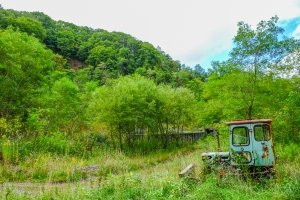 「幌内」の文字が残る。「内」の文字は左の一部が欠けてしまっている縦構図で撮影。これもかっこよい。後ろの山は、低品位の石炭や岩を捨てた「ずり山」だ。ちょうど芽吹きの季節だった。廃トラックと炭鉱5月中旬に、今年初めての探索をしてきた。探索初日は家族連れで、翌日は北