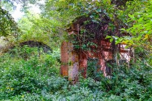 幌内炭砿布引坑、立坑櫓の巻揚室に隣接していたレンガの建物。天井の骨組みが露出し、そこから入り込む光が美しい。新緑の木々が、失われた屋根の代わりとなっていた。★SpecialThankstoAttheplace-その場所で-ひこさん