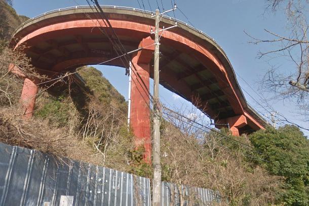 赤沢の廃ループ橋として有名な廃スポットですね。昭和40年段に民間の建設会社がループ橋上部に宅地分譲を計画して、作ったものらしいですが、事業破綻後そのまま放置された道のようですね。2005年に1部崩落してビックリさせていますね。私は近くで見るだけで、登ったりはし