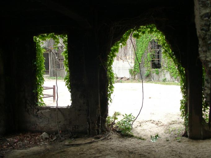 2002年11月1日 大久野島の旧軍施設. Okunojima. #1:発電所跡の内部。写真では伝えにくいが息を 呑むほどの広がりがある。 #2:発電所跡の外観, (1) 発電所跡 (写真#1-#10) 巨大な 廃墟。内部には8基の発電機が設置されていたが足りず、不足分は本土