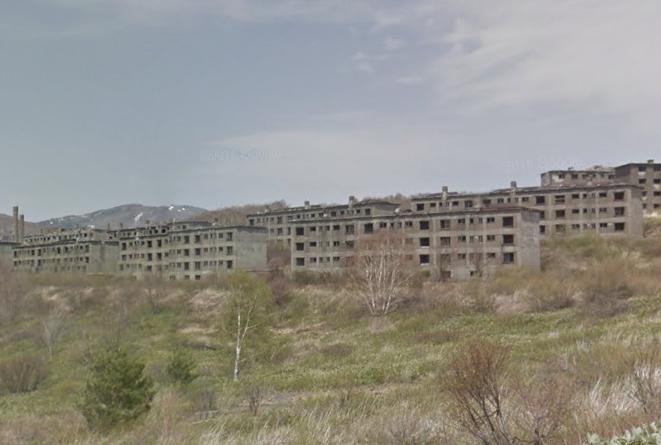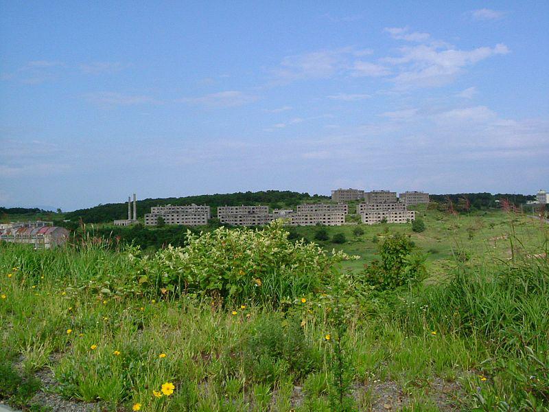2005年3月20日 緑ヶ丘アパート群や学校の建物は相変わらず廃墟をさらけ出したまま(写真2枚目)。3 年前に中に入って見た時の写真はHPで紹介済みだがとても気味悪く、今日は学校だっ た建物の一部に入ってみた(写真3枚目)。3年前に来た時よりも