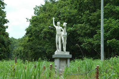 若…駒…園…と書かれていますね。う~ん、そういえば会社の上司の旦那さんが話していたような…なんでも、昔は凄い遊園地だったと…興味津々、行ってみましょう!関係者以外立入禁止の看板がありましたが、スルスル~と行くと…銅像?少年と馬ですね。裸の少年…チ〇コ出てますよ