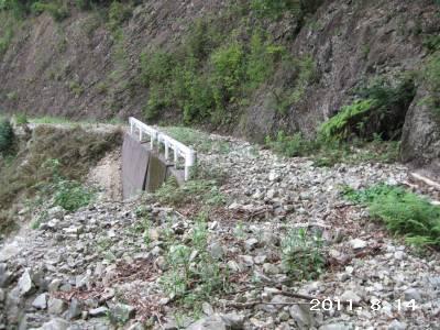 2011年7月15日 林道五ノ滝線。 02.JPG 名丸の文字も見えます。 03.JPG 進んで間もなく、名丸谷を 渡る丸山橋。 04.JPG 05.JPG . 蔵王タ゛ム周辺 廃道 紀伊長島 R422の行き着く先 三重 久瀬谷 三重 水無峠 三重 名丸谷林道 三重 白倉林道 謎の橋 三重 光