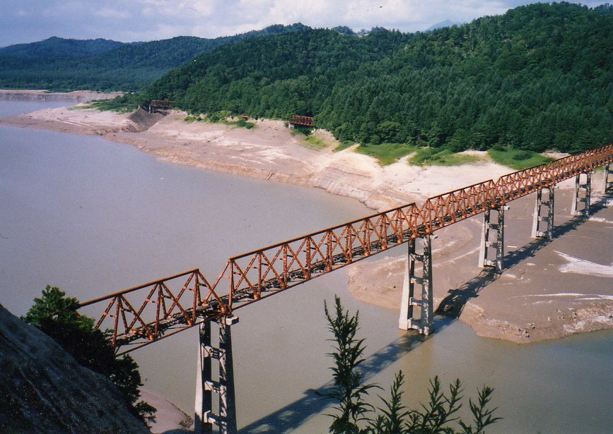 かつての森林鉄道の橋梁・三弦橋です。 森林鉄道の橋梁としては、異例なほどに長い橋です。 S37年、大夕張ダムの完成によって水没した森林鉄道の軌道の代替に、 ダム湖上に架けられた橋ですが、 その6年後には林鉄が廃止になり、この三弦橋も廃橋梁