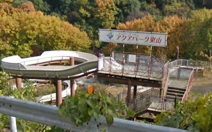 アクアパーク東山跡地。三条通を挟み南側山斜面にある。1991年にオープンし2007年頃廃業。