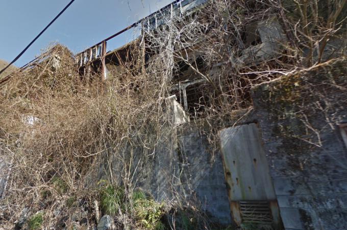 【全景】 20年以上の廃墟が見えてきた。 鬱蒼と生茂っている木々に飲み込まれている 古虎渓は、いつの日か完全に同化してしまうだろう。 近く寄ると建物右側から潜入出来 そうだが、急斜面な為人によっては苦労するだろう。 靴をサンダル等でここに入ろうと すると