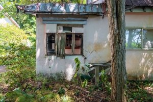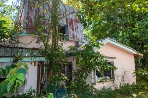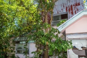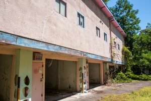 国道101号線沿いに建っている廃墟。屋根は既に無く、壁もかなり落ちてしまっています。入り口。錆だらけの鉄柱のアーチの下に「危険!立入禁止」の立て看板が2つ立てられています。また門の脇には「満空」の看板。ホテルだったようです。