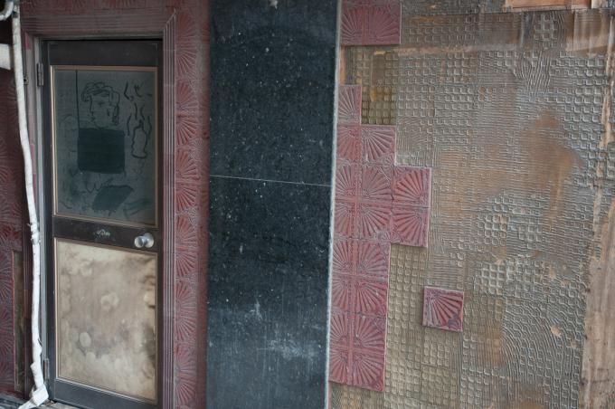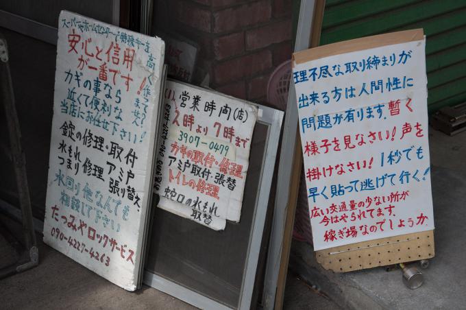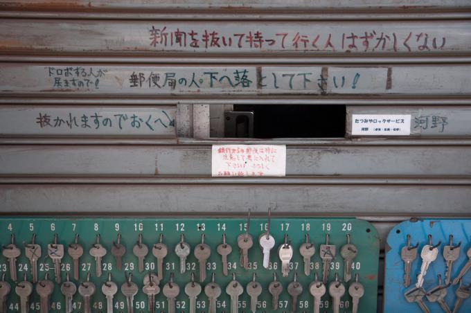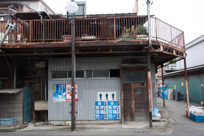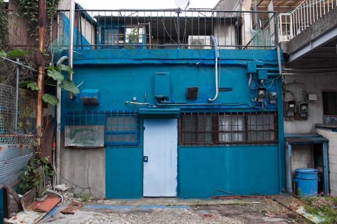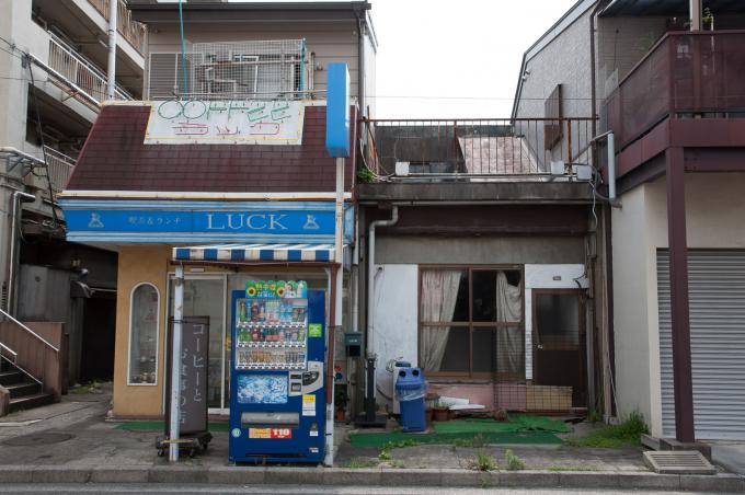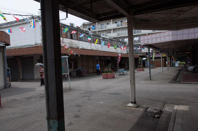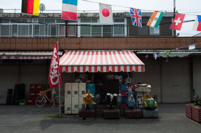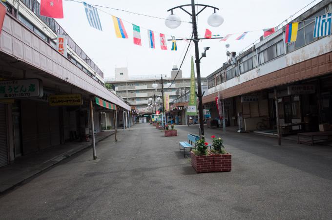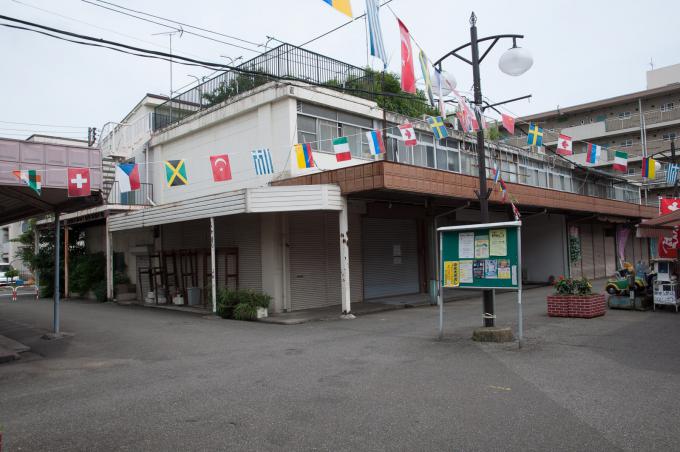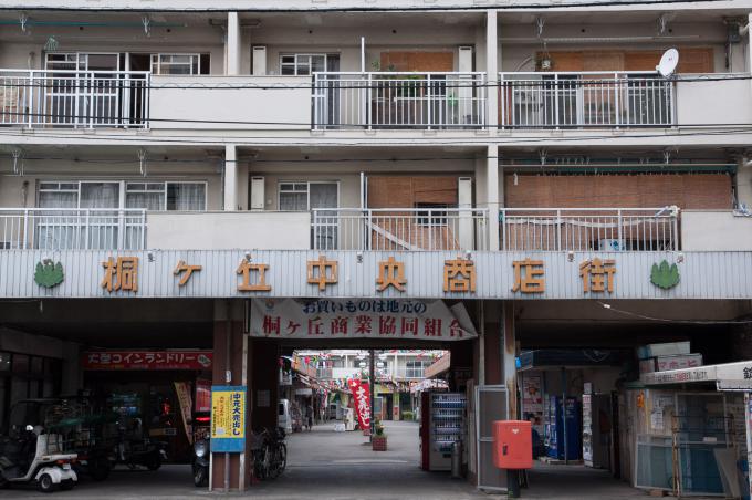 闇市横丁の聖域が立石の「呑んべ横丁」(残念ながら消滅)ならば、団地商店街の聖域はここであると考える。前回までの「都営桐ヶ丘団地」の核。それがこの「桐ヶ丘中央商店街」。この建物の向こうが商店街になっている。1階部分は部屋が無く端の階段だけになっていて、「桐ヶ丘中央商店街」の看板が掲げられている。金属板にオレンジ色の文字。緑のマークもポイント。そして昭和丸出しの商店長屋が直線に並び、頭上を万国旗がはためく。商店街を歩いていると見えないが店舗には2階があり、倉庫などに使っていたと思われる。住居になってたケースもあるかな。