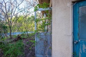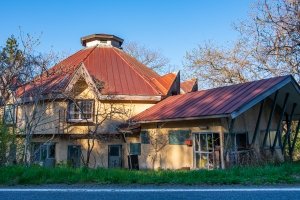 廃墟_円形ホテル「エノモト」_周辺風景 東北廃墟旅の途中、道路脇に明らかな廃墟が目についた。 外観だけでもと思い、撮影の時間を少し取って近づいてみる。 廃墟_円形ホテル「エノモト」_円形部分アップ はしごが不自然に切れている。