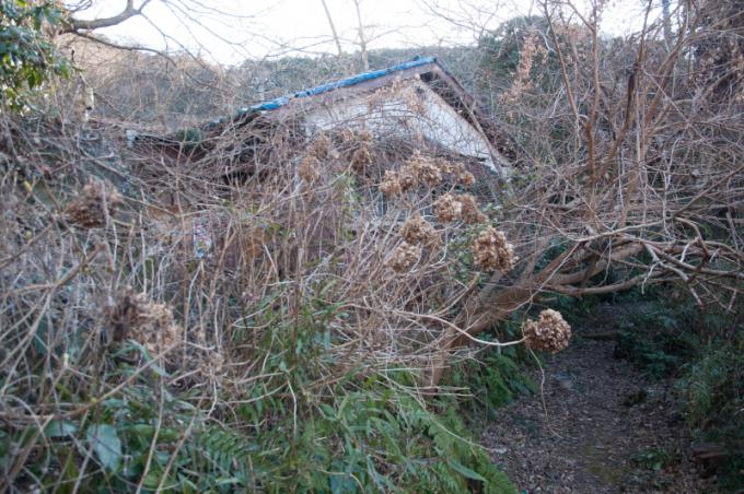 まずはこれが谷戸の入口付近。家の雨戸は閉まっていて、超寂しい雰囲気が。。。。ここんちは玄関のガラスが割れ、庇は枯れ草ぼうぼう。こっちの家の入り口には落ち葉が溜まって草が生え放題。ちょっとゾクゾクッとします。更にはこんな鬱蒼とした様子に。。。両側は、廃墟とまでは