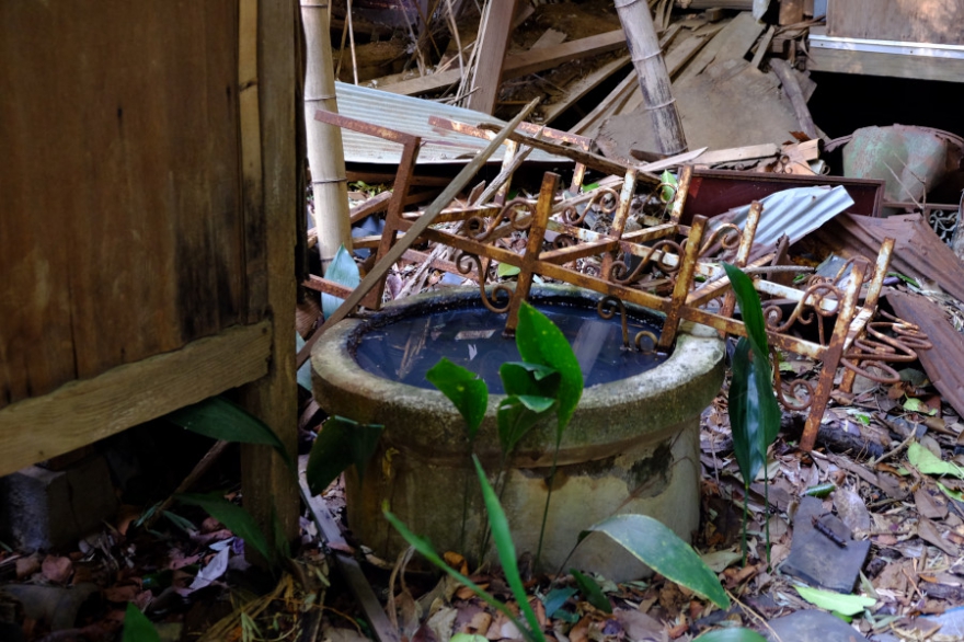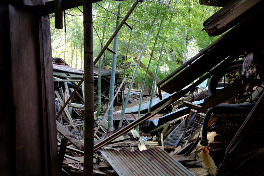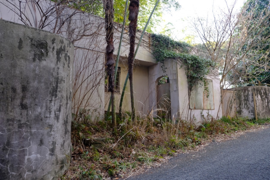 北条氏の本拠地として知られるお城を見渡せる、住宅地の高台に残された病院周囲のマンションや豪邸の中にポツリと建っていて違和感を感じます竹やぶの中を進む建物はほぼ崩壊していて、病院と言われなければ何だか分からない状態です目の前の民家から普通に見られてるのかなぁ。と