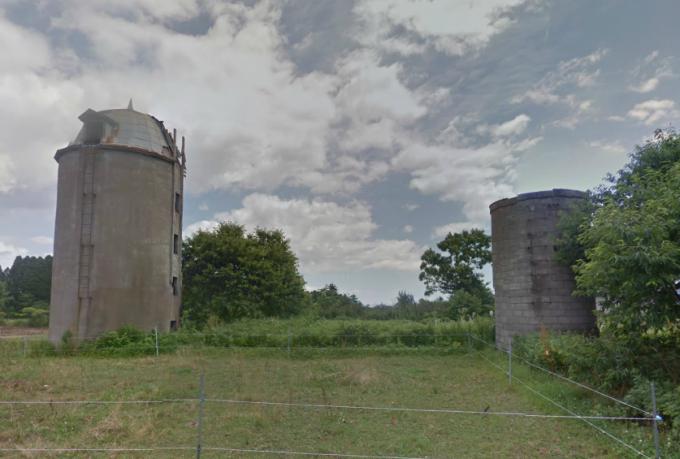 北海道上磯郡知内町中ノ川の廃サイロ群。 牧場自体は現役施設と思われる。